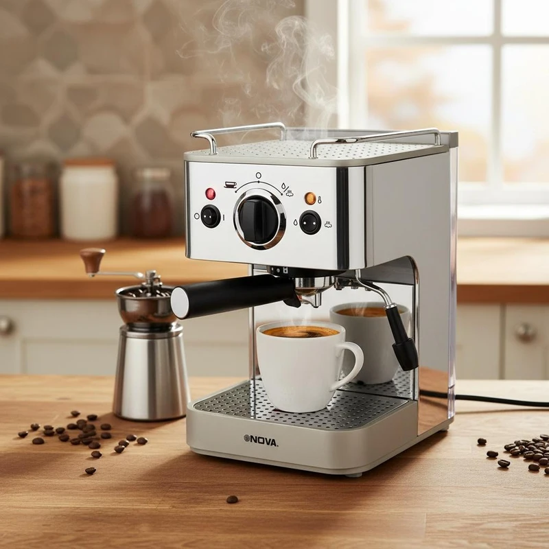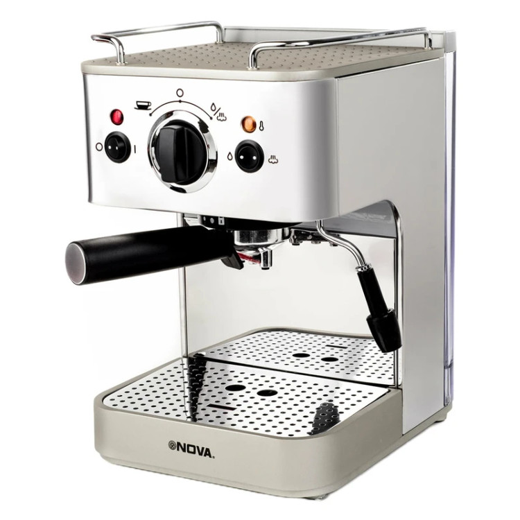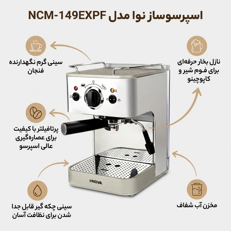 قهوه یکی از نوشیدنیهای بسیار محبوب است که افراد زیادی عادت به نوشیدن آن دارند. از این رو، دستگاههای قهوهساز متعددی در بازار وجود دارد تا لذت نوشیدن قهوه و تهیه یک قهوه با کیفیت را برای افراد چندین برابر کند. اسپرسو ساز نوا مدل NCM-149EXPS یکی از دستگاههای قهوه ساز بسیار خوب بازار است که عملکرد فوقالعاده آن، این دستگاه را جز بهترینهای بازار کرده است. اسپرسو ساز نوا مدل NCM-149EXPS یک دستگاه ساده قهوهساز است که تنها برای شما قهوه آسیاب شده را آماده سرو میکند. این دستگاه دارای ابعاد مناسب و جمع و جوری است که فضای زیادی را از کابینت آشپزخانه یا میز کارتان اشغال نمیکند. نوا یکی از برندهای خوشنام بازار در زمینه دستگاههای نوشیدنیساز است.